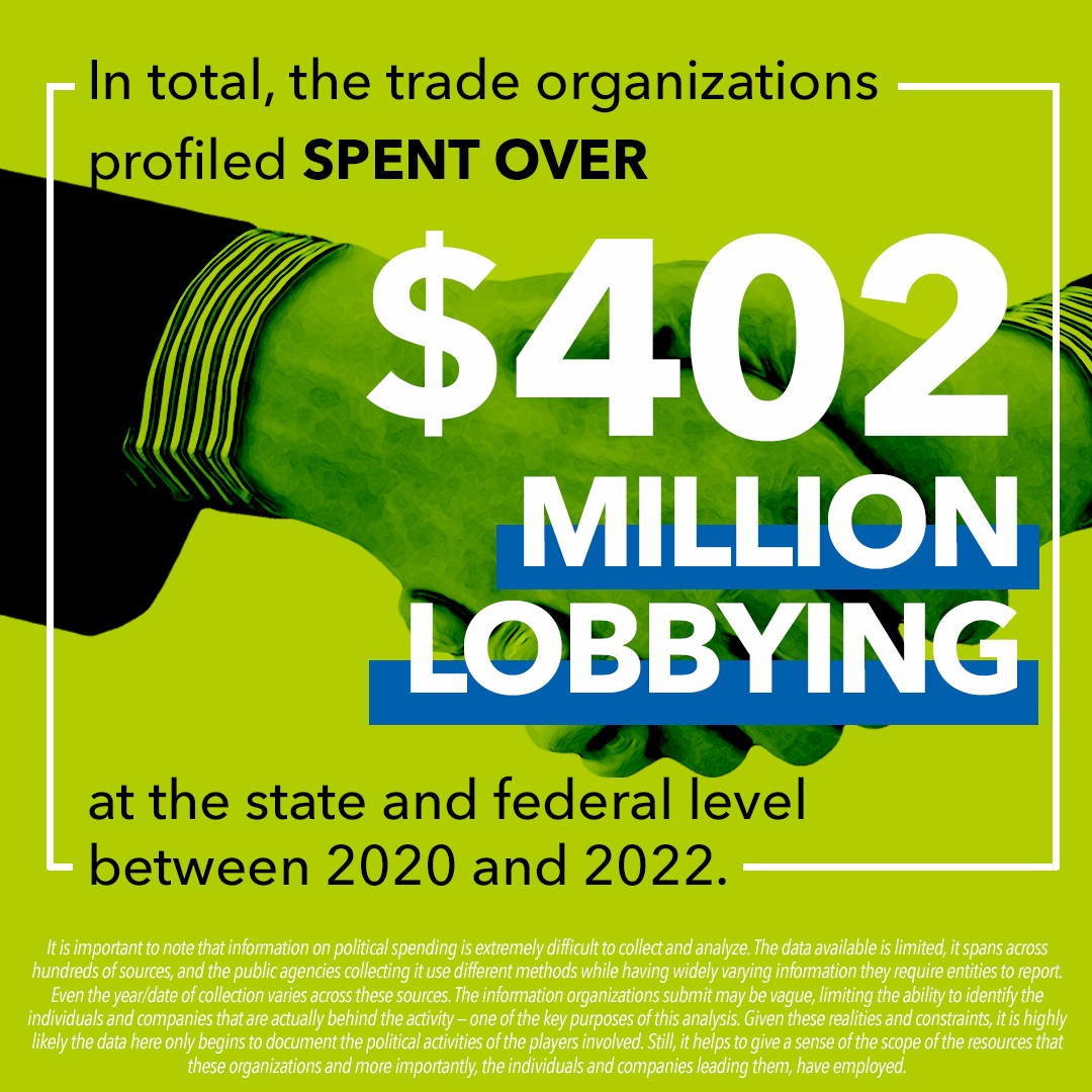 • In total, the organizations profiled spent over $402 million between 2020 and 2022 in lobbying at the state and federal level. Associated PACs collected a total of $167 million from 2019 to 2022