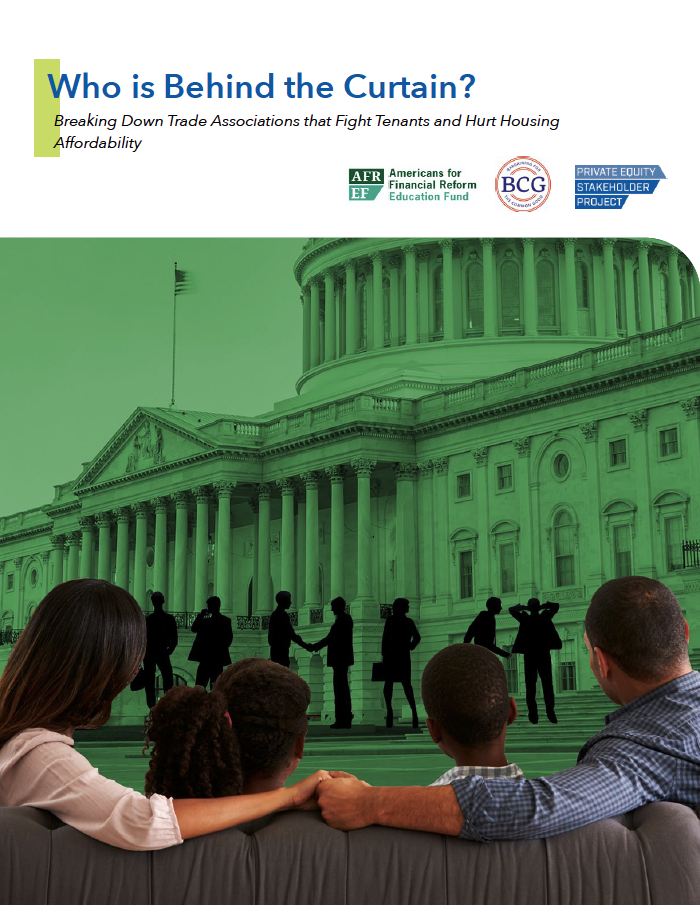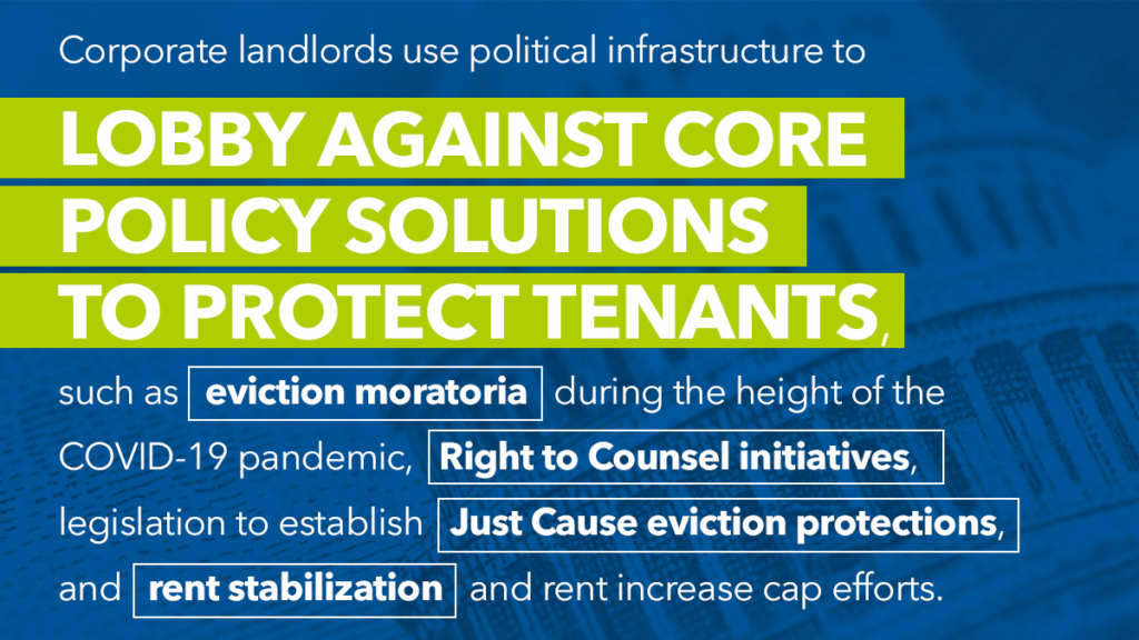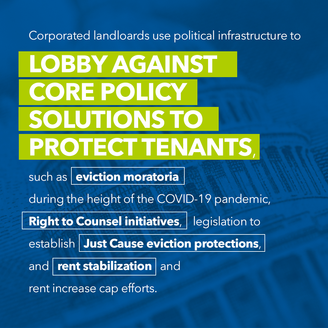 • These corporations use this political infrastructure to lobby against core policy solutions to protect tenants, such as eviction moratoria during the height of the COVID-19 pandemic, Right to Counsel initiatives, legislation to establish Just Cause eviction protections, and rent stabilization and rent increase cap efforts.